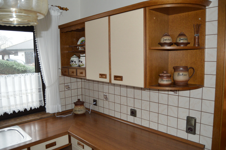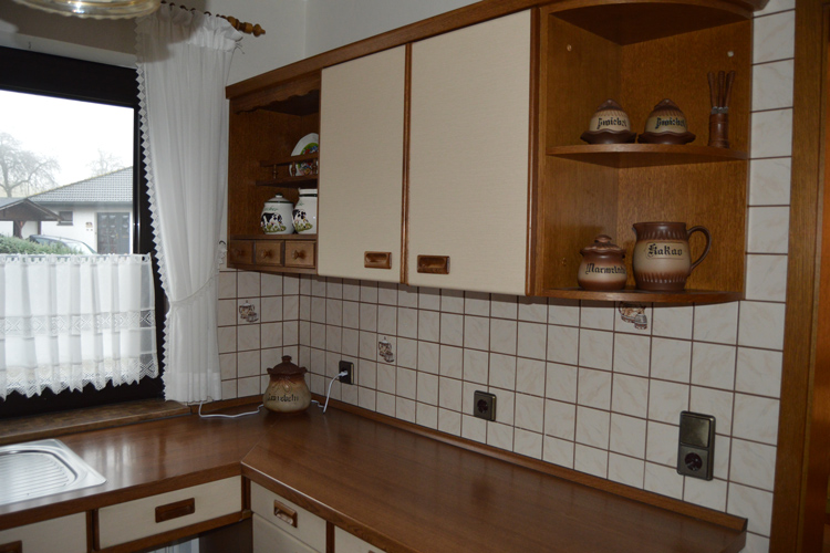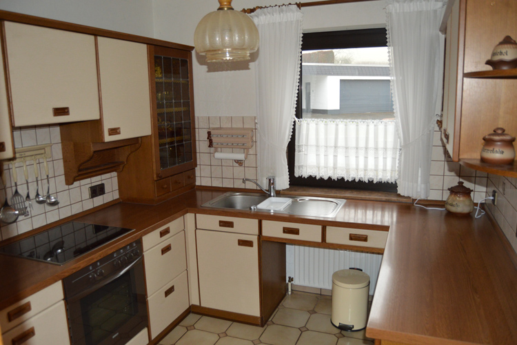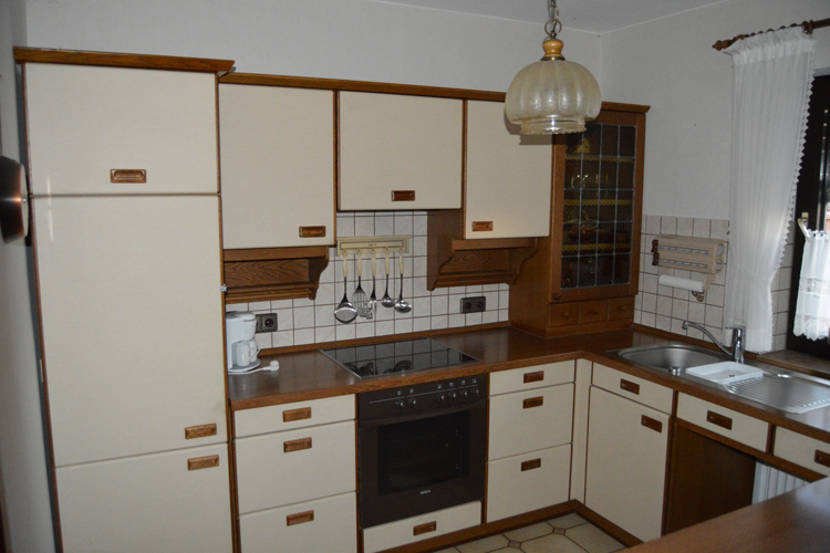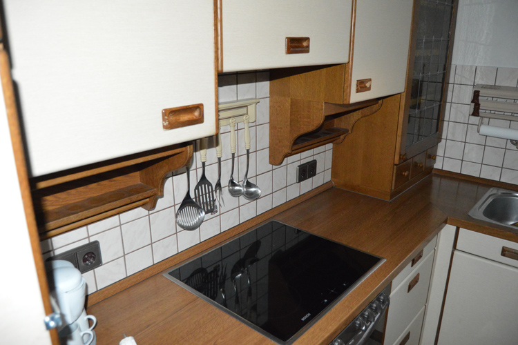 Die große Küche hat eine Fläche von 7,3 qm. Zur Ausstattung gehören ein Kühlschrank mit Eisfach, ein Elektroherd mit Vierplatten-Kochfeld und Backofen, Spüle, Kaffeemaschine, Eierkocher und Toaster.