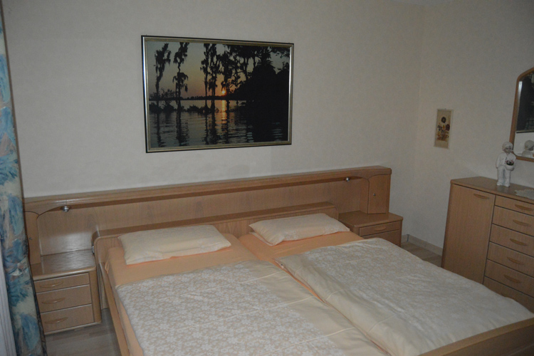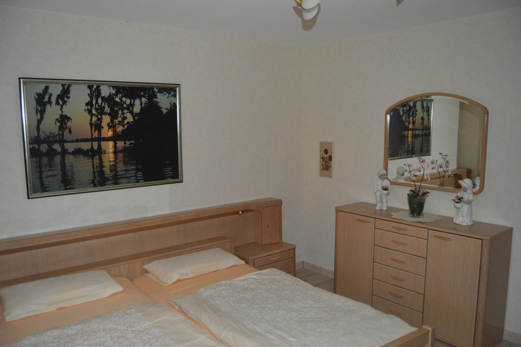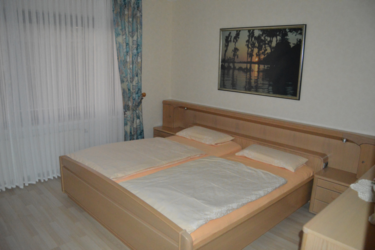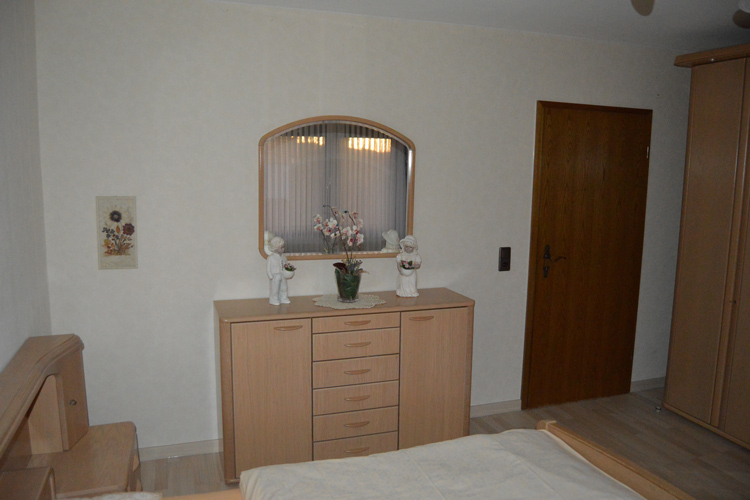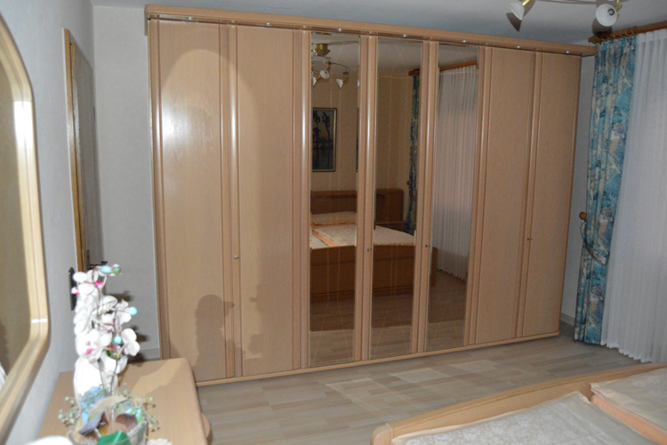 Ihr Schlafzimmer hat eine Größe von 16,6 qm. Die Betten sind am Kopfteil verstellbar, in der Kopfleiste ist eine Beleuchtung integriert, Der große Schrank mit seinen drei Ganz-Körper-Spiegeln bietet genügend Platz.